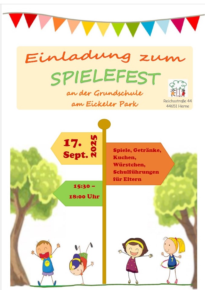 Sommerfest 2025 01.08.2025 Keine Kommentare Einladung zum Spielefest an der Grundschule am Eickeler Park. Hier finden Sie alle Informationen zur Veranstalsatung.